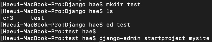 test라는 디렉토리를 만들어서 그곳에서 장고 프로젝트를 만들어보겠습니다