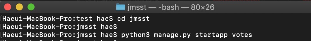 프로젝트 루트 디렉토리 jmsst로 이동해서 votes라는 애플리케이션을 만들어 보겠습니다.
