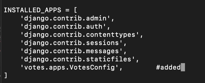 - votes 앱의 설정 클래스는 startapp votes 명령을 실행했을때 자동생성된 apps.py에 VotesConfig라고 정의되어있습니다.