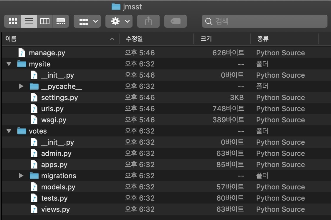 를 입력하면 장고가 votes 애플리케이션 디렉토리와 필요한 파일들을 생성해줍니다.