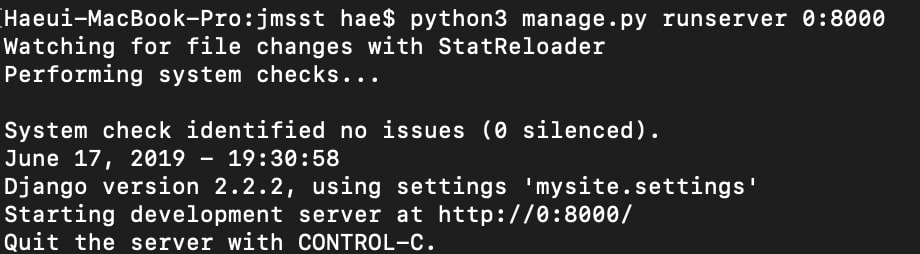 - python3 manage.py runserver # ip,port 미지정시 디폴트 127.0.0.1, 8000포트 사용