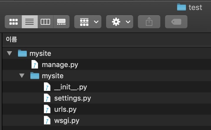 장고가 알아서 프로젝트에 필요한 디렉토리와 파일들을 생성해줍니다.